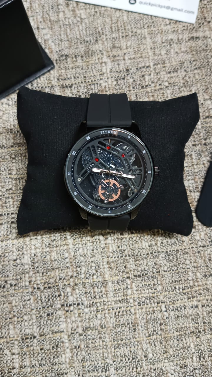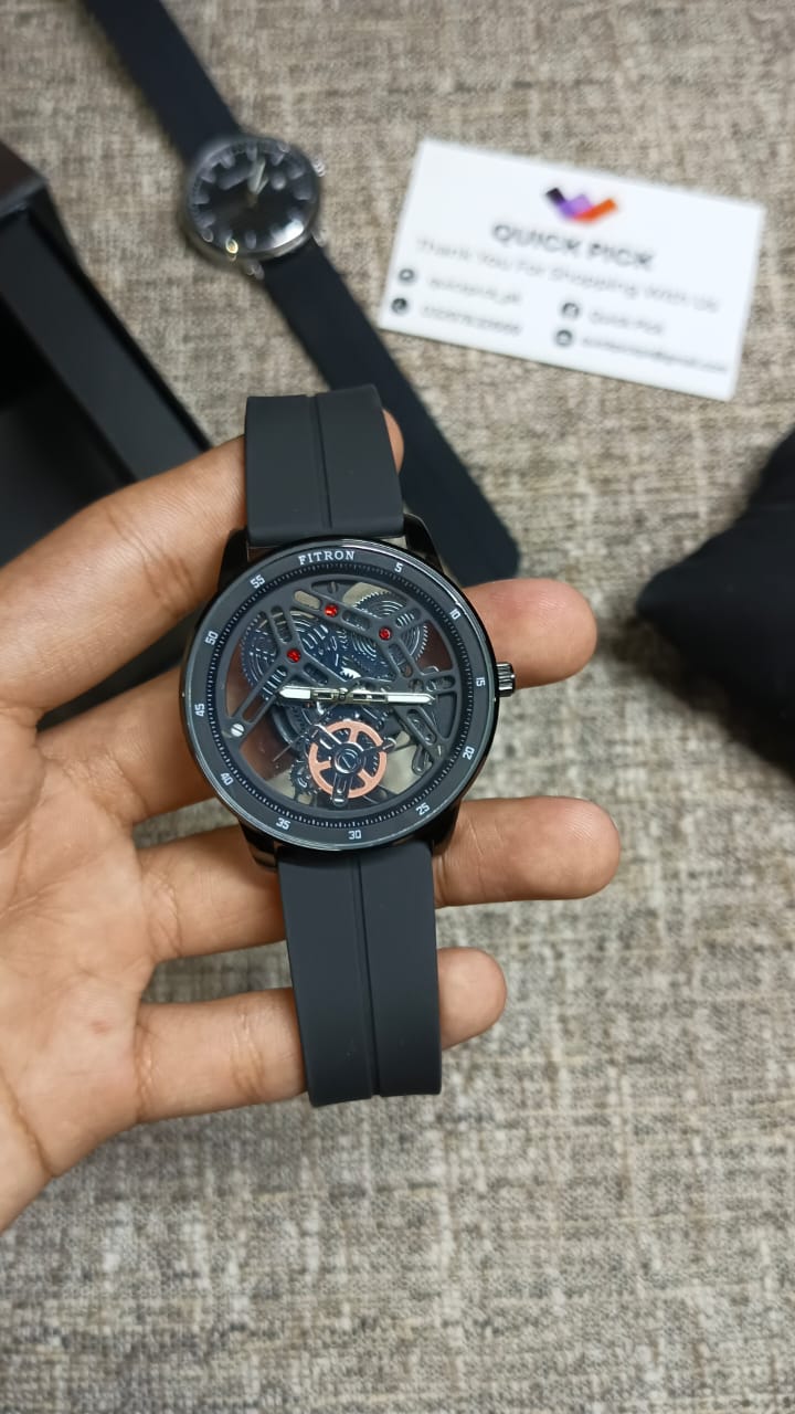 The Fitron Skeleton watch showcases precise mechanical craftsmanship with its transparent dial, revealing intricate inner workings. Designed for connoisseurs, it balances technical sophistication and modern style, offering both reliability and a distinctive visual appeal. Perfect for those who appreciate horological expertise in a refined timepiece.
